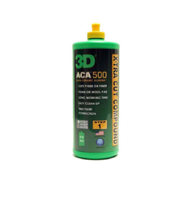 3D ACA 500 X-TRA CUT COMPOUND es fabricado con ALFA-ALUMINA CERAMICA. Alfa-Alúmina Cerámica es un nuevo y revolucionario abrasivo el cual ha sido desarrollado para generar menor calor, mayor velocidad y para corregir las capas transparentes más difíciles e inclusive pinturas de una sola capa.