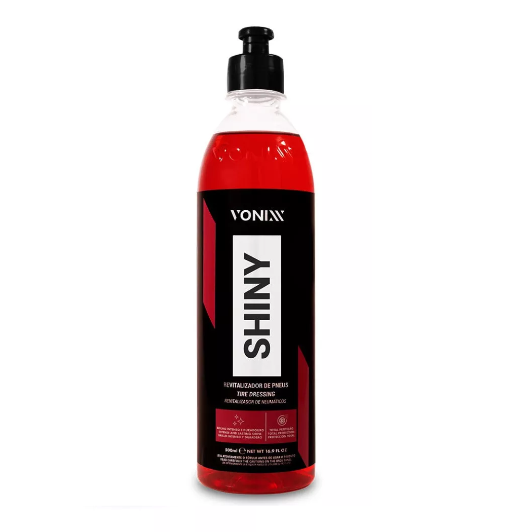 SHINY es un producto desarrollado exclusivamente para uso en neumáticos que renueva, protege y da a los neumáticos un brillo intenso y duradero. El producto no sale cuando entra en contacto con el agua, alcanza una durabilidad de hasta 60 días, rinde de 15 a 20 aplicaciones en autos pequeños y mantiene la apariencia en el neumático húmedo brillante.